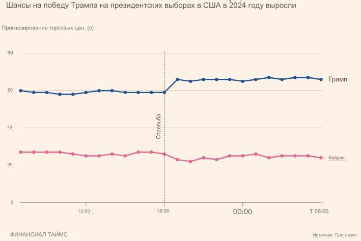Подразумеваемые коэффициенты на победу Трампа в ноябре подскочили сразу после стрельбы, согласно данным торгов на сайте политических ставок PredictIt.