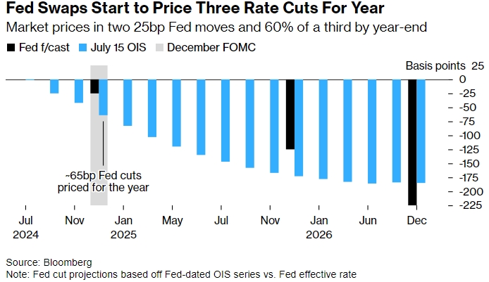 Два снижения ставки на четверть пункта уже полностью оценены в цене на 2024 год, а вероятность третьего снижения ставки в понедельник достигла 60%. Первый шаг широко ожидается в сентябре, хотя экономисты Goldman Sachs заявили, что они "видят веские основания" для того, чтобы чиновники снизили ставки уже в июле.