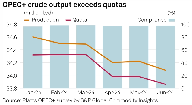 ОПЕК и ее союзники во главе с Россией сократили добычу сырой нефти на 130 000 баррелей в день в июне, но страны-члены альянса, на которые распространяются квоты на добычу, произвели на 220 000 баррелей в день больше своего целевого показателя, показал ежемесячный обзор Platts OPEC+ от S&P Global Commodity Insights 9 июля.