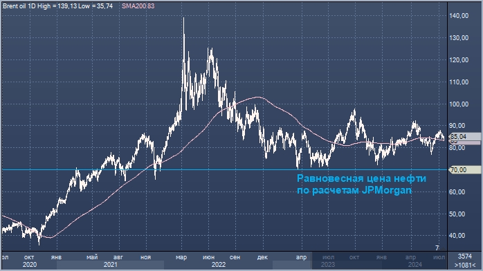 Согласно отчету аналитиков JPMorgan, равновесная цена на нефть марки WTI составляет 70 долларов за баррель. С учетом того, что вечером в среду, 17 июля, этот бенчмарк торговался около $82,93/барр., равновесная цена на 15,5% ниже этого значения.