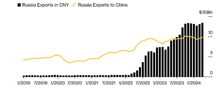 Хотя Китай не присоединился к санкционной политике Запада против России, с декабря 2023 года платежи между двумя странами усложнились. США пригрозили наложить вторичные санкции на банки, которые способствуют торговле с товарами, связанными с военными отраслями России. Российские компании сообщили местным СМИ в июне, что проблема была решена с использованием небольших региональных банков после встречи президента Путина с китайским президентом Си Цзиньпином в мае, но затем США расширили критерии санкций.
