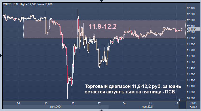 Торговый диапазон для валютной пары юань/рубль в 11,9-12,2 руб. за юань остается актуальным на пятницу, при этом возможны попытки отката под отметку 12 руб. за юань, прогнозирует начальник отдела экономического и отраслевого анализа Промсвязьбанка (ПСБ) Евгений Локтюхов.