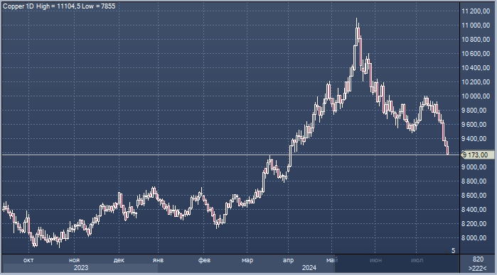 Цены на медь снижаются шестой день подряд, невзирая на то, что Народный банк Китая увеличил поддержку экономики, неожиданно снизив процентные ставки 22 июля. Это произошло после того, как на прошлой неделе инвесторов разочаровало отсутствие краткосрочных стимулирующих мер по итогам завершившегося пленума ЦК Коммунистической партии.