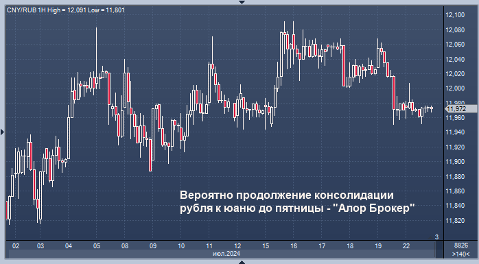 Вероятно продолжение консолидации курса рубля по отношению к юаню до оглашения итогов заседания Банка России по ключевой ставке в пятницу, 26 июля 2024 года, полагает руководитель направления инвестиционного консультирования "Алор Брокера" Алексей Антонов.