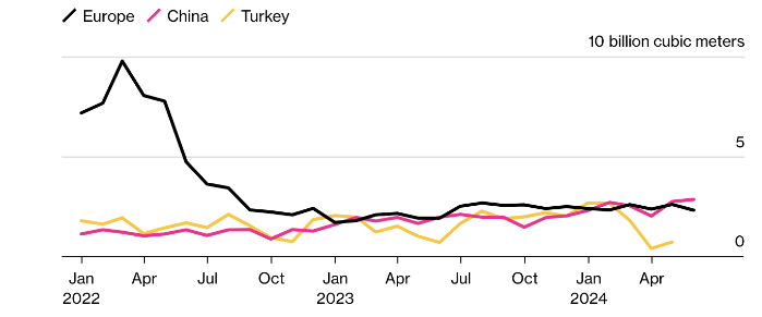 Тем не менее это сопоставимо с 15,2 млрд кубометров, которые российский газовый гигант отправил в Китай за первую половину этого года. Данные основаны на информации китайской таможни и оценках российского министерства экономики. По расчетам, в помесячном выражении в 2024 году Европа и Китай поочередно становились крупнейшими покупателями российского трубопроводного газа.