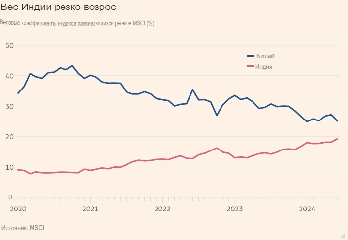 "10 или 11 лет назад Индия составляла 6-7 процентов от индекса. Сейчас ее доля приближается к 20 процентам", - говорит Кунджал Гала, глава отдела глобальных развивающихся рынков в Federated Hermes. Поскольку индийские акции и так относительно дороги, изменение индекса "ставит интересную дилемму перед долгосрочными инвесторами, такими как мы, или инвесторами, которые больше ориентируются на оценку "запаса прочности"".