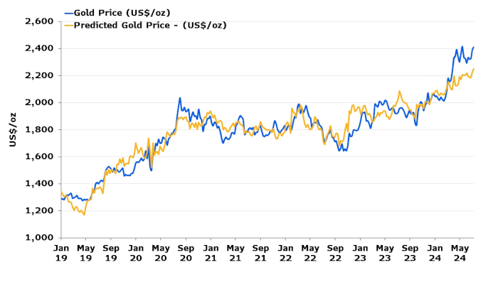 Модель BI показывает, что текущая цена золота была бы справедливой при более оптимистичном сценарии, когда доллар остается стабильным по отношению к широкой валютной корзине, но юань ослабевает до 7,5 за доллар, цены на недвижимость в Китае продолжают снижаться до 5% в годовом исчислении, а восприятие геополитических рисков растет в преддверии выборов в США.