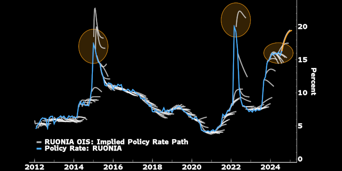 Перед сегодняшним заседанием денежный рынок закладывал в цены, что ставка достигнет пика в диапазоне 19–20%. Однако сложно сказать, чем именно были обусловлены подобные ожидания: непосредственными прогнозами, что так и произойдет, или же нежеланием рисковать и готовностью платить за хеджирование рисков более масштабного роста ключевой ставки.