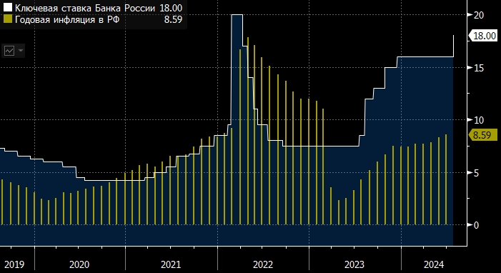 "26 июля Банк России ожидаемо повысил ключевую ставку на 2пп (до 18%), но сопроводил повышение более жесткой риторикой, чем мы и рынок ожидали, - пишут эксперты. - В этой связи мы повысили ожидаемую траекторию по ключевой ставке на 2024-2025 гг. В октябре 2024 года не исключаем повышения еще на 100 б.п. по мере уточнения бюджетных рисков и динамики кредитования. Момент для снижения ставки видим не ранее апреля 2025 года с ориентиром 14% к декабрю".
