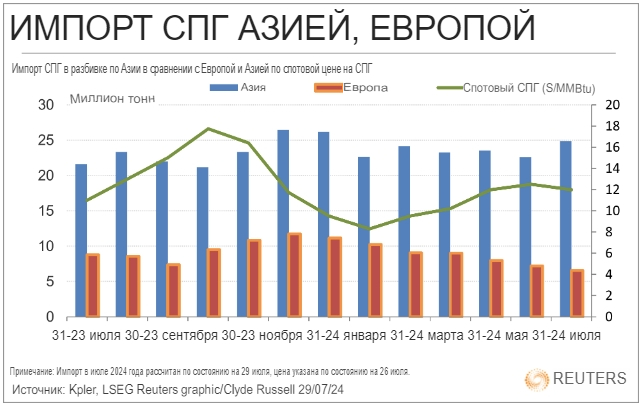 Причиной изменения глобальных потоков СПГ во многом являются более высокие цены в Азии: на неделе по 26 июля спотовые грузы для доставки в Северную Азию оценивались в 12,00 долларов за миллион британских тепловых единиц (mmBtu).