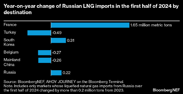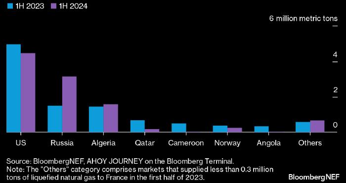 В первой половине этого года Франция импортировала рекордный объем российского сжиженного природного газа, хотя общий объем импорта СПГ в страну остался на уровне прошлого года. Согласно анализу BloombergNEF, резкое увеличение притока российского СПГ во Францию могло иметь несколько причин: европейские покупатели оптимизировали портфели из-за кризиса в Красном море, сроки действия предыдущих контрактов истекли, а Европейский Союз распространил систему торговли выбросами CO2 на морские перевозки.