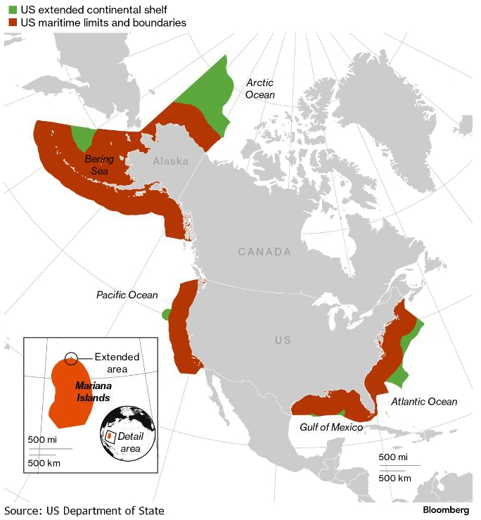 Страны, ратифицировавшие Конвенцию Организации Объединенных Наций по морскому праву 1982 года, проходят длительный международный процесс по достижению соглашения о том, где проходят границы подводных континентальных шельфов. Эти демаркации важны, поскольку на них основаны исключительные экономические права на потенциально прибыльные ресурсы морского дна. Например, Россия, Канада и Дания — от имени Гренландии — подали конкурирующие претензии на районы в высокогорных районах Арктики, поскольку изменение климата открывает регион для большего количества морских перевозок и исследований.