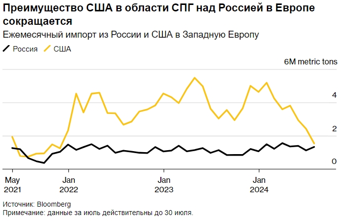 Преимущество США над Россией в поставках СПГ в Европу сокращается. Ежемесячный импорт из России и США в Западную Европу. Источник: Bloomberg. Примечание: данные за июль действуют до 30 июля