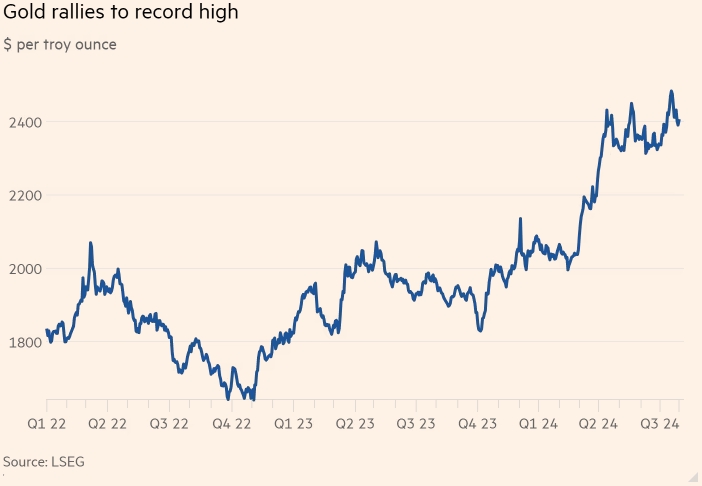В начале месяца цена на золото достигла рекордно высокого уровня в 2 483,60 долларов за тройскую унцию, что было вызвано растущими ожиданиями снижения процентных ставок, которое благоприятно скажется на таких недоходных активах, как драгоценные слитки, поскольку снизит доходность облигаций, а также неопределенностью в отношении результатов президентских выборов в США. Металл торгуется по цене около 2 417 долларов за тройскую унцию.