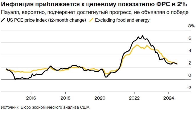 Что касается заседания на этой неделе, которое завершится в среду, то трейдеры оценивают вероятность снижения ставки как очень низкую. Однако есть ожидания, что Федеральный комитет по открытым рынкам, устанавливающий ставку, даст понять, что если не будет серьезных заминок с данными, то сентябрьский шаг вполне возможен.