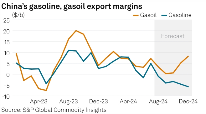 Аналитики Commodity Insights ожидают, что экспортная маржа Китая на бензин останется отрицательной в августе—декабре из-за ослабления регионального спроса, особенно в четвертом квартале, когда закончится пиковый сезон вождения, предполагая, что в 2024 году объем экспорта останется стабильным.
