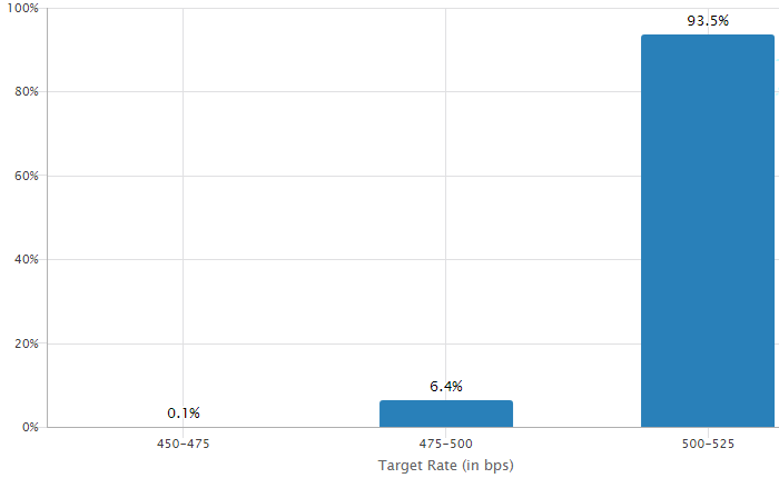 Вероятность ее снижения на 25 б.п. до 5,00–5,25% на заседании FOMC 18 сентября оценивается в 93,5% (см. ниже).