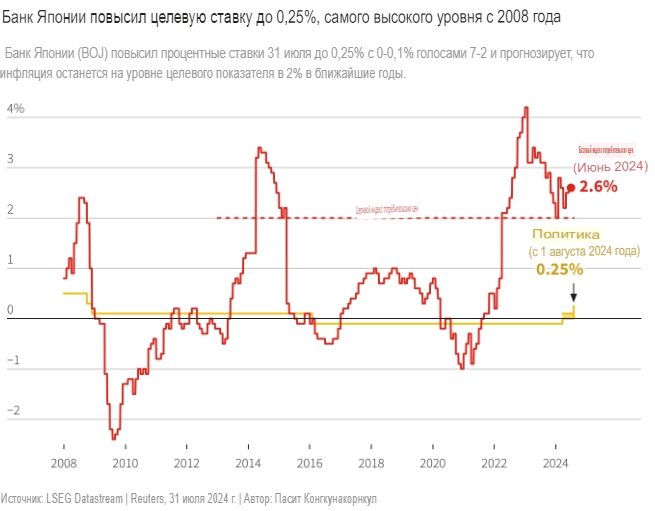 "Этот сдвиг может снизить привлекательность коротких позиций по иене, поскольку сокращение разницы в ставках между BOJ и другими центральными банками, особенно ФРС, которая, как ожидается, будет снижать ставки в сентябре и декабре, делает иену менее привлекательной для сделок carry trades".