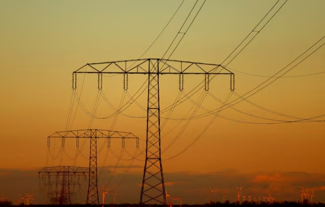 Опоры с высоковольтными линиями электропередач видны перед ветряными турбинами во время заката недалеко от Везелитца, Германия 18 ноября 2022 года. REUTERS/Lisi Niesner