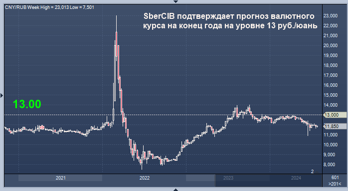 SberCIB Investment Research подтверждает прогноз валютного курса на конец года на уровне 13 руб. за юань и 95 руб. за доллар, сообщается в комментарии аналитиков банка.