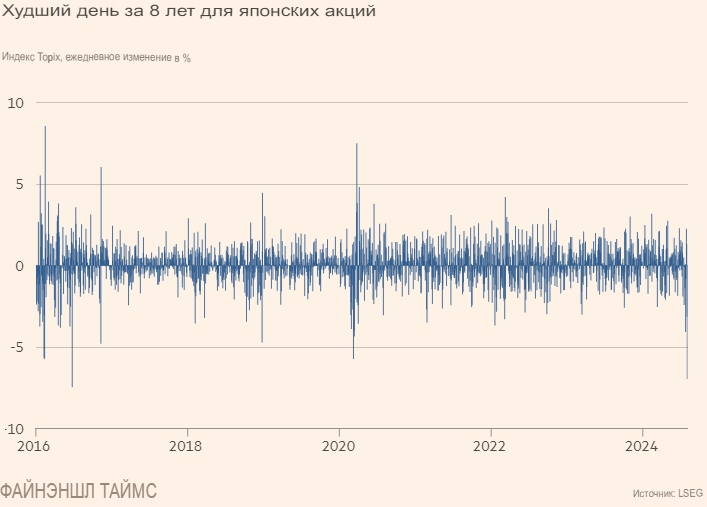 Токийский индекс Topix, достигший рекордного максимума в прошлом месяце, упал на 6 процентов, продемонстрировав самое сильное однодневное падение с 2016 года, вызванное опасениями по поводу влияния роста иены на прибыли японских компаний.