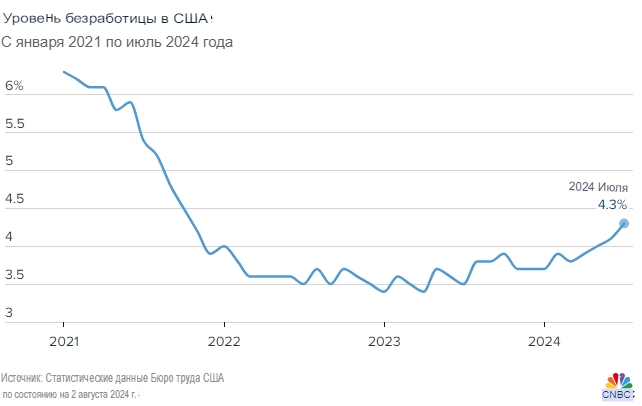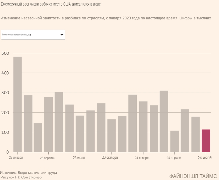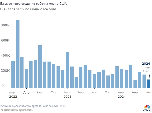 Рынок труда США в июле остыл сильнее, чем ожидалось, добавив 114 000 рабочих мест при росте уровня безработицы, что усилило аргументы в пользу того, что Федеральная резервная система снизит процентные ставки на своем сентябрьском заседании.