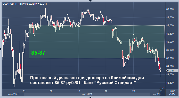 Прогнозный диапазон для пары рубль/доллар на ближайшие дни составляет 85-87 руб./$1, для пары рубль/евро - 92-94 руб./EUR1, полагает директор департамента операций на финансовых рынках банка "Русский Стандарт" Максим Тимошенко. По мнению эксперта, на стороне рубля выступает свежая статистика Росстата, которая показала замедление недельной инфляции в России до 0,08% с 0,11% неделей ранее, общее снижение цен на продовольственные товары. Также в числе факторов поддержки национальной валюты - текущие меры регулятора и жесткая риторика ДКП ЦБ РФ.