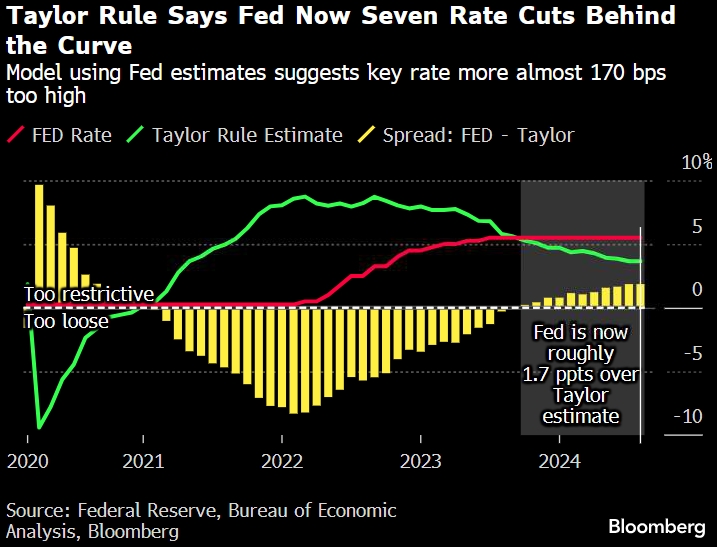 Правило Тейлора гласит, что ФРС теперь семь раз снизит ставки. Модель, использующая оценки ФРС, предполагает, что ключевая ставка завышена почти на 170 б.п. Источник: Федеральная резервная система, Бюро экономического анализа, Bloomberg.
