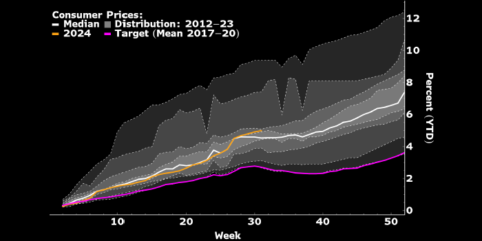 Потребительская инфляция в РФ в % г/г по неделям года: белым — медианное значение, серым — разброс в 2012—2023 гг., оранжевым — текущая динамика (2024 г.), фиолетовым — целевой уровень (среднее значение в 2017—2020 гг.). Источник: Bloomberg