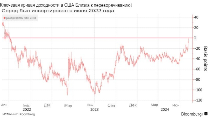 Доходность двухлетних облигаций, снизившаяся сегодня на 14 базисных пунктов, находится на волоске от падения ниже доходности 10-летних казначейских облигаций впервые с июля 2022 года.