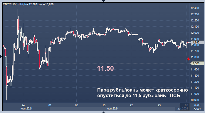 Пара рубль/юань может краткосрочно опуститься до 11,5 руб./юань на фоне слабого спроса на валюту, полагают аналитики Промсвязьбанка (ПСБ).