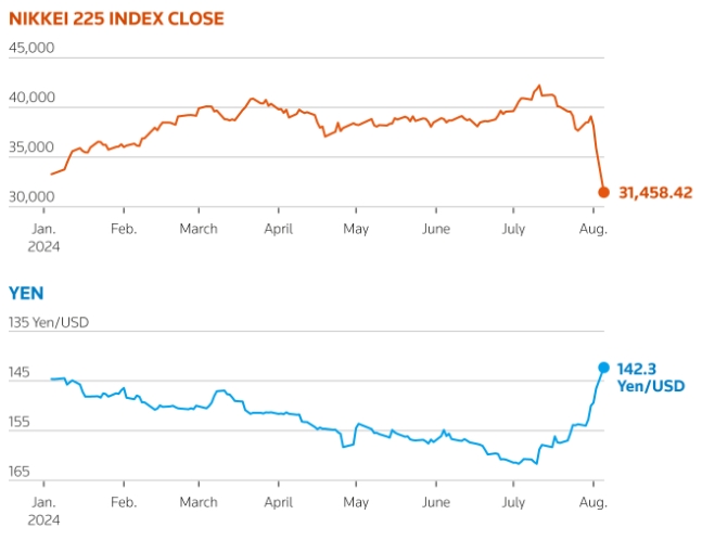 На графиках показано закрытие индекса Nikkei 225 и уровень пары иена/доллар США с января 2024 года.