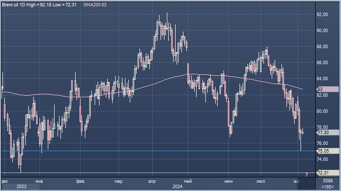 Цена на нефть марки Brent достигла минимума на уровне 75 долларов за баррель после распродажи, вызванной опасениями по поводу возросших рисков рецессии, написали аналитики Goldman Sachs в заметке от 5 августа.