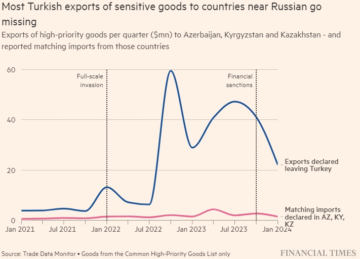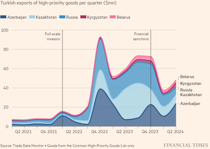Экспорт из Турции высокоприоритетных военных товаров, отправляемых в Россию или предполагаемым посредникам Москвы, таким как Азербайджан и Казахстан, резко возрос с начала военного конфликта. Согласно расчетам FT, основанным на данных турецкой таможни, за первые шесть месяцев этого года он составил $85 млн, что значительно превышает $27 млн за тот же период 2022 года.