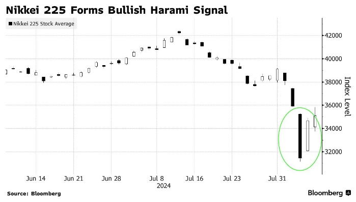 Во вторник фондовый индекс Nikkei 225 сформировал свечу, тело которой располагалось в пределах диапазона предыдущего дня, образуя так называемую модель «Харами», которая указывает на разворот во время нисходящего тренда.