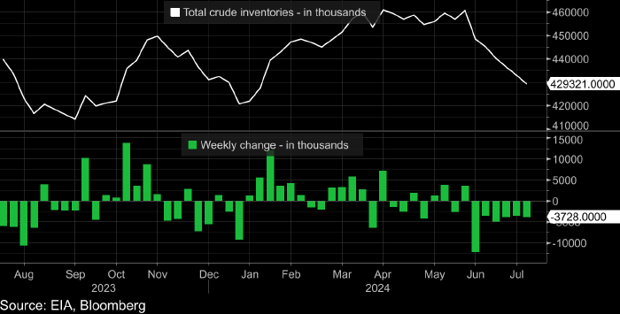 И, в-третьих, коммерческие запасы сырой нефти в США снизились шестую неделю подряд до самого низкого уровня с февраля. Сам же данный тренд на снижение запасов оказался самым продолжительным с начала 2022 г.