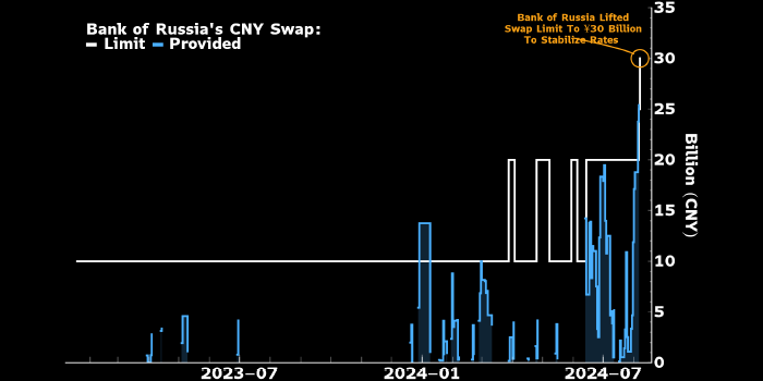 Белым — лимит ЦБ РФ по операциям «валютный своп» в юанях, голубым — фактический объем этих операций. Желтым указан момент повышения регулятором лимита до 30 млрд юаней. Источник: Bloomberg