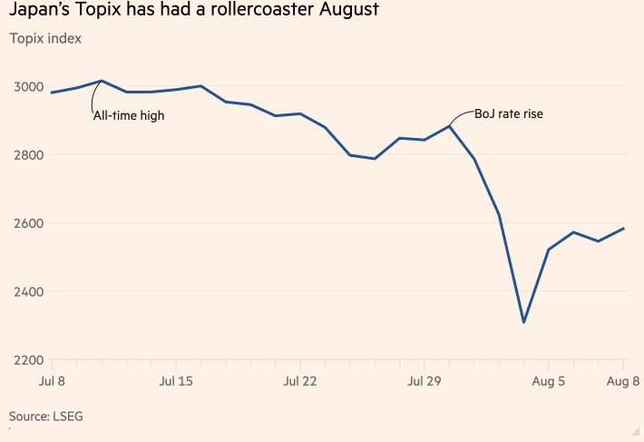 Во вторник, когда брокеры смогли убедить инвесторов в том, что распродажа была чрезмерной, акции восстановились, показав самый большой однодневный рост с 2008 года. В пятницу индекс Topix был на 3 процента ниже уровня закрытия рынка неделей ранее.