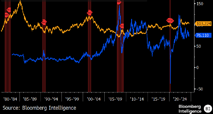 Желтым — индекс доллара DXY, синим — нефть WTI. Вертикальные бордовые линии обозначают начало и конец рецессий в США. Источник: Bloomberg
