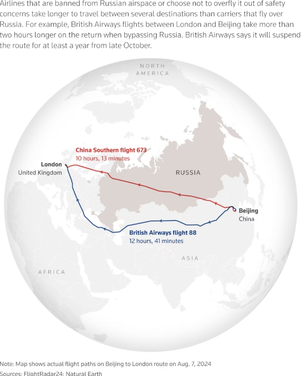 Такие группы, как Lufthansa, заявили, что конкуренция со стороны китайских перевозчиков, которым разрешено летать через воздушное пространство России, сократила их доходы, а доходность Lufthansa упала на маршрутах, на которых она конкурирует с этими перевозчиками.