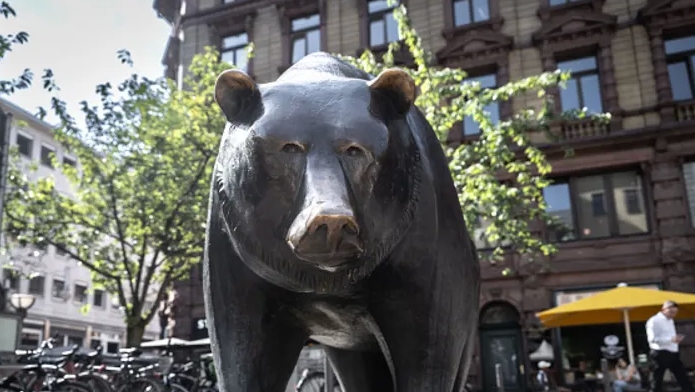 Медведь, символ падающих цен на фондовом рынке, стоит в виде бронзовой скульптуры перед зданием Франкфуртской фондовой биржи 6 августа 2024 года. Альянс изображений | Getty Images