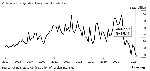 Китая прямые портфельные инвестиции, отраженные как пассивы в платежном балансе, упал почти на $15 млрд в период с апреля по июнь 2024 года. Это 2-й случай за всю историю статистики по показателю (рассчитывает Государственное управление валютного обмена SAFE), когда он стал отрицательным. За первые шесть месяцев 2024 г. он упал примерно на $5 млрд.