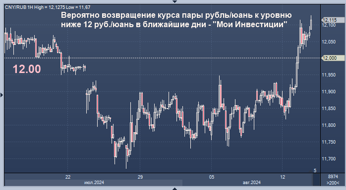 Вероятно возвращение курса пары рубль/юань к уровню ниже 12 руб./юань в ближайшие дни, полагают аналитики телеграм-канала "Мои Инвестиции".