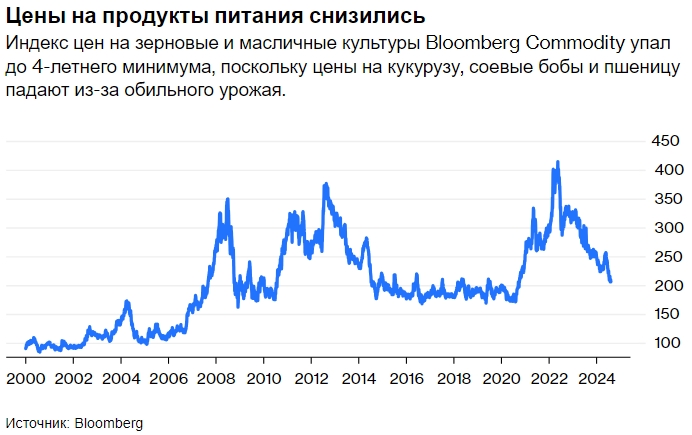 Цены на продукты питания снижаются. Субиндекс Bloomberg Commodity для зерновых и масличных культур упал до 4-летнего минимума, поскольку цены на кукурузу, сою и пшеницу снизились благодаря обильным урожаям. Источник: Bloomberg
