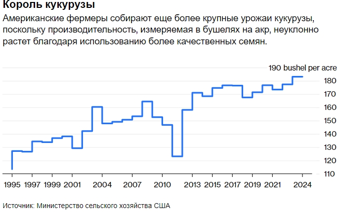 Королева кукуруза. Американские фермеры собирают еще большие урожаи кукурузы, поскольку производительность, измеряемая в бушелях с акра, постоянно растет благодаря более качественным семенам. Источник: USDA