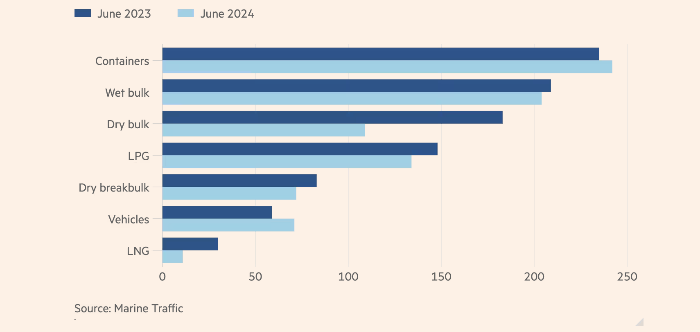 По данным группы по анализу судоходства Marine Traffic, однако в прошлом месяце через канал прошло всего 13 судов с СПГ — это менее половины, чем в июле 2022 года. Число наливных судов, проходящих через канал, также сократились на 35% до 129 за тот же период. Официальные лица Панамы не видят больших проблем, так как другие типы судов, такие как контейнеровозы, использовали водный путь на обычном уровне, а доходы канала выросли благодаря интенсивным торгам за ограниченное количество слотов.