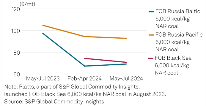 Средняя цена на уголь FOB Россия порты Дальнего Востока 6000 ккал/кг NAR также снизилась на 12 долл. США за тонну в годовом исчислении до 92,80 долл. США за тонну в период с мая по июль, а средняя цена на уголь FOB Черное море 6000 ккал/кг NAR составила 70,75 долл. США за тонну в период с мая по июль, снизившись с 74,40 долл. США за тонну в период с февраля по апрель.