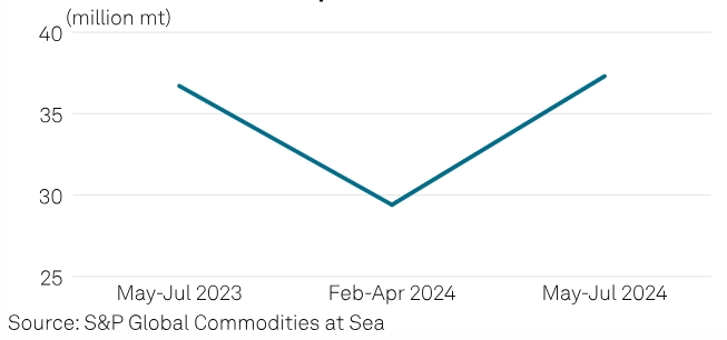 По данным S&P Global Commodities at Sea, в мае—июле Россия экспортировала 37,3 млн тонн энергетического угля по сравнению с 29,4 млн тонн в период с февраля по апрель. По данным CAS, экспорт российского энергетического угля в период с мая по июль превысил 36,7 млн тонн, экспортированных в соответствующий период 2023 года.