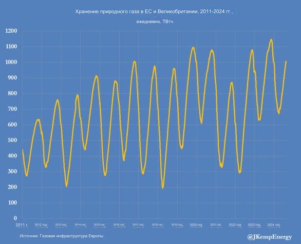 Однако, судя по динамике за последнее десятилетие, прогнозируется, что запасы достигнут 1 173 ТВт-ч до начала зимнего истощения в конце октября - начале ноября.