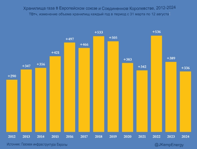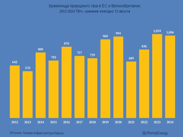 На 12 августа запасы в ЕС и Великобритании составили 1 006 ТВт-ч, что немного ниже 1 024 ТВт-ч на соответствующую дату прошлого года; хранилища были заполнены чуть менее чем на 88 % по сравнению с более чем 89 % в 2023 году.